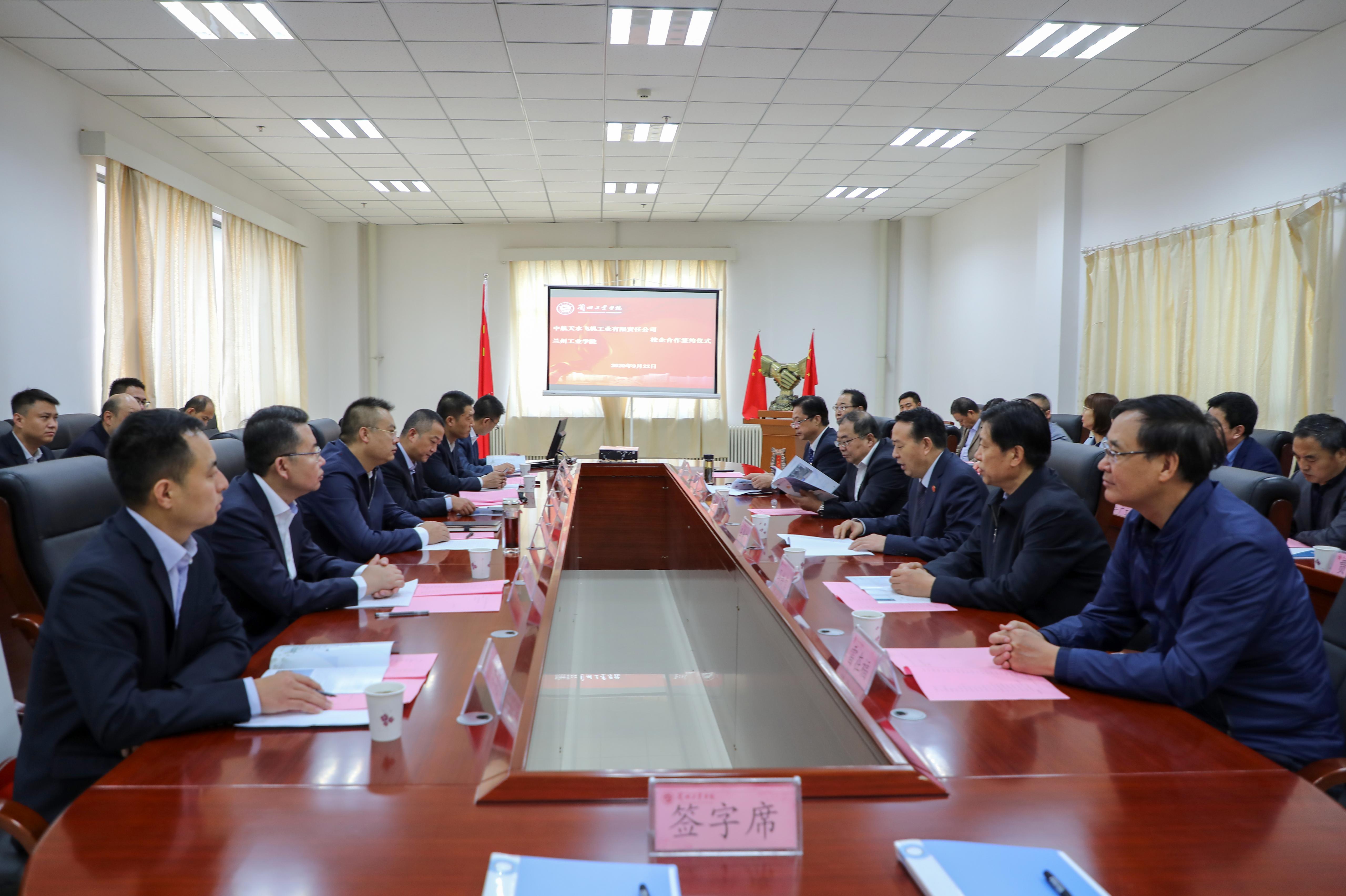 中国甘肃网9月24讯 9月22日上午,兰州工业学院与中航天水飞机工业有限责任公司在图书馆二楼会议室签订校企合作协议。中航天水飞机工业有限责任公司党委书记、董事长田维军,副总经理蒋世见,学校党委书记俞子泓,校长王华栋,副校长马铁信、李贵山出席会议。党委副书记黄荟铭主持仪式。