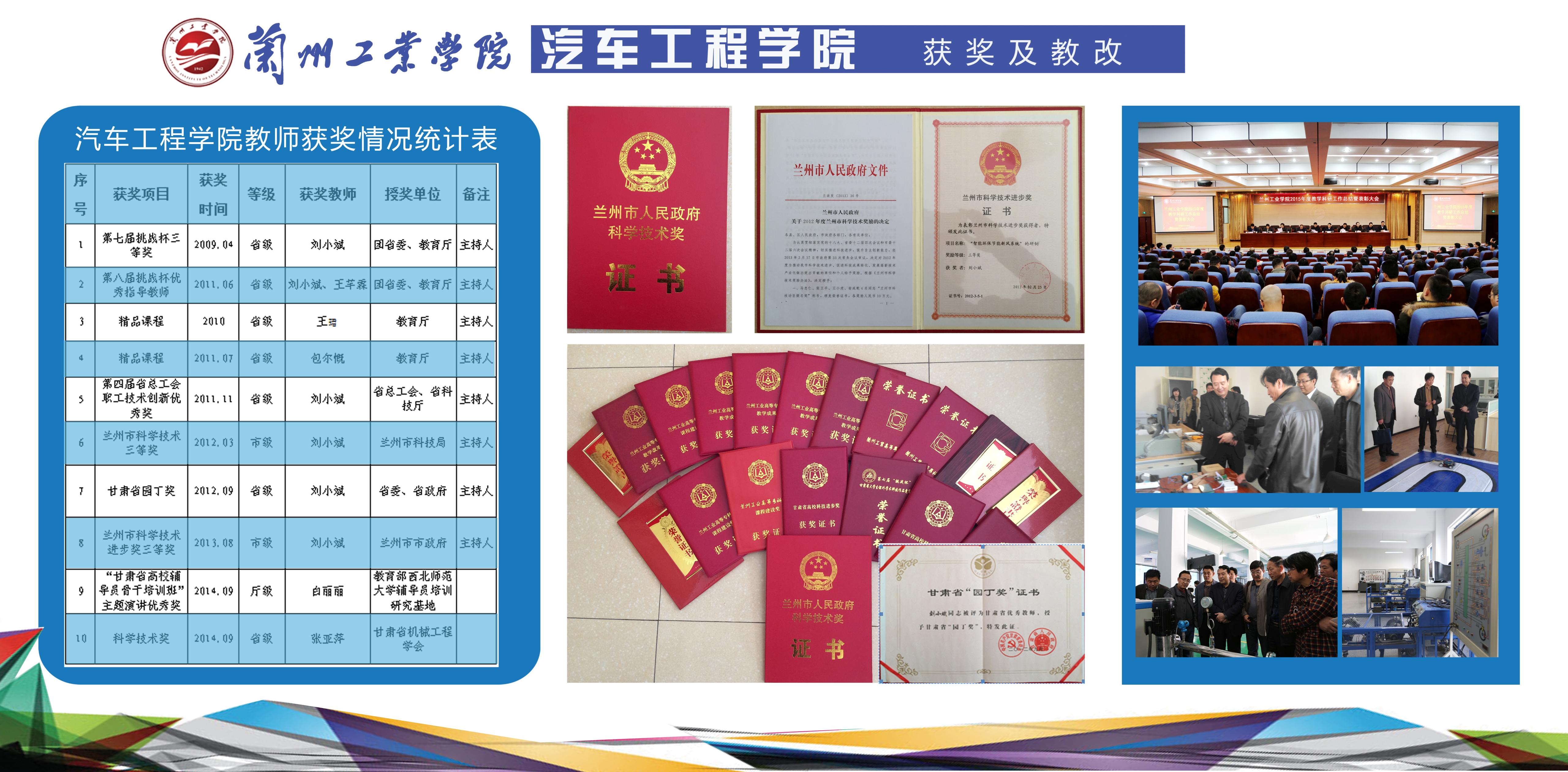 近年来,学院教师发表学术论文260余篇,其中SCI、EI收录近30篇。主持或参与省级、厅局级、校级科研项目共计130余项;完成企业横向科研项目10项。获得国家发明专利10项,实用新型专利95项,软件著作版权20项。主持甘肃省教育厅教学改革项目8项,校级教学改革项目32项。获省级一流本科专业建设点1个,省级一流本科课程1门,校级一流课程1门,校级重点课程3门,校级虚拟仿真实验项目2项,甘肃省汽车工程创新创业教育教学团队1个。获省高校科技进步一等奖1项,三等奖5项,获兰州市科学技术三等奖1项,获甘肃省机械工程学会科学技术一等奖3项,二等奖4项,三等奖7项。甘肃省第四届职工优秀技术创新成果优秀奖1项。出版教材与专著18部,完成《汽车构造》、《汽车发动机电控技术》两门甘肃省省级精品课程。获甘肃省新能源汽车动力电池与电驱动行业技术中心创新平台认定。